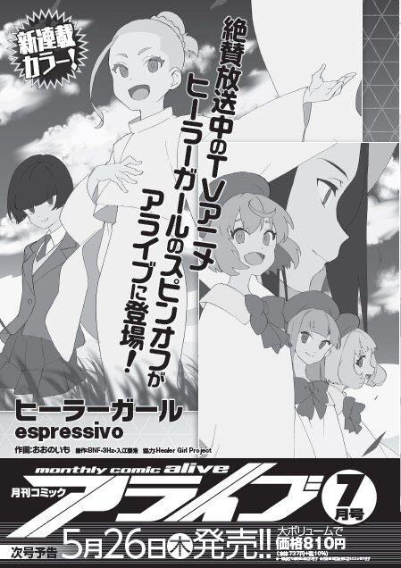 Aunque no el único pero si de los pocos, la serie animada Healer Girl fue anunciada en su versión manga después del estreno de su anime. El anuncio se dio en Comic Alive de Kadokawa como un próximo proyecto Spin off que saldrá el 26 de mayo. El aviso estuvo en la publicación del magazín comic alive donde se conoció la primera imagen dibujada por Imo Ouno de Healer Girl espressivo (Titulo del manga).