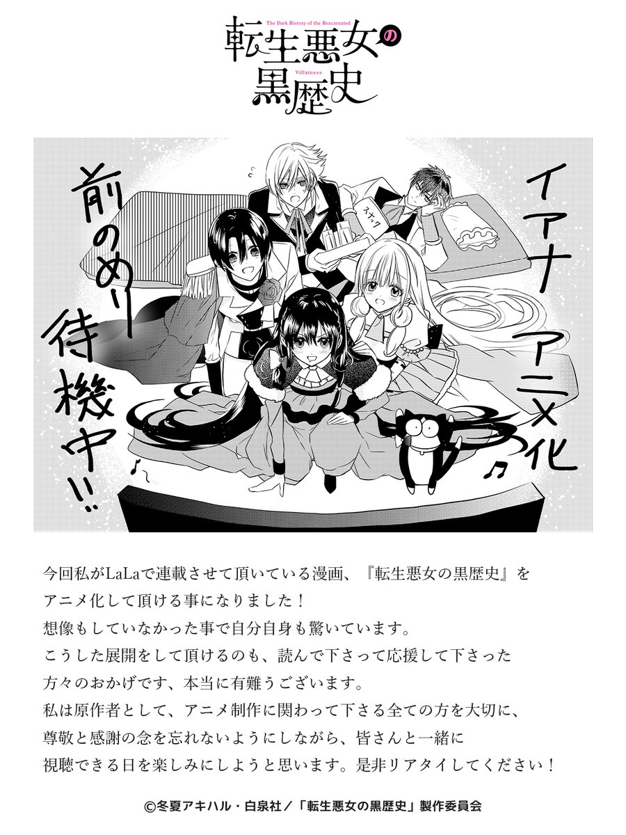 El manga que he estado publicando en LaLa, «The Dark History of the Reincarnated Villainess«, se ha convertido en anime.