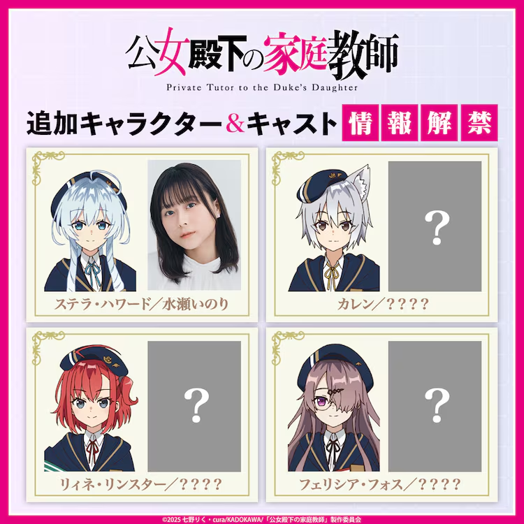 Este sábado la producción para el anime «Kōjo Denka no Kateikyōshi«, presentó a la actriz de voz Kōjo Denka no Kateikyōshi que se une a la serie para interpretar a Stella, además de revelar la presentación de 3 nuevos personajes y su reparto que serán revelados durante 3 semanas consecutivas.